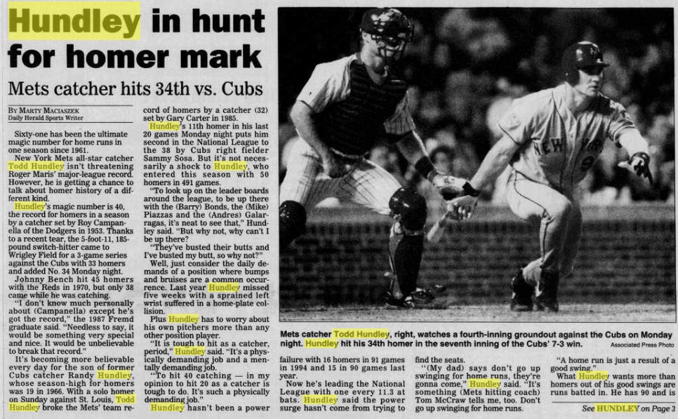 Hundley, the son of Cubs’ catching legend Randy, hit a career-high and Mets’ record 41 in 1996. At the time that tied Hall of Famer Roy Campanella (1953 Brooklyn Dodgers) and made Hundley just the third catcher in MLB history to hit 40 homers in a season. Hundley and Wilson also played in the MLB All-Star Game that season.
